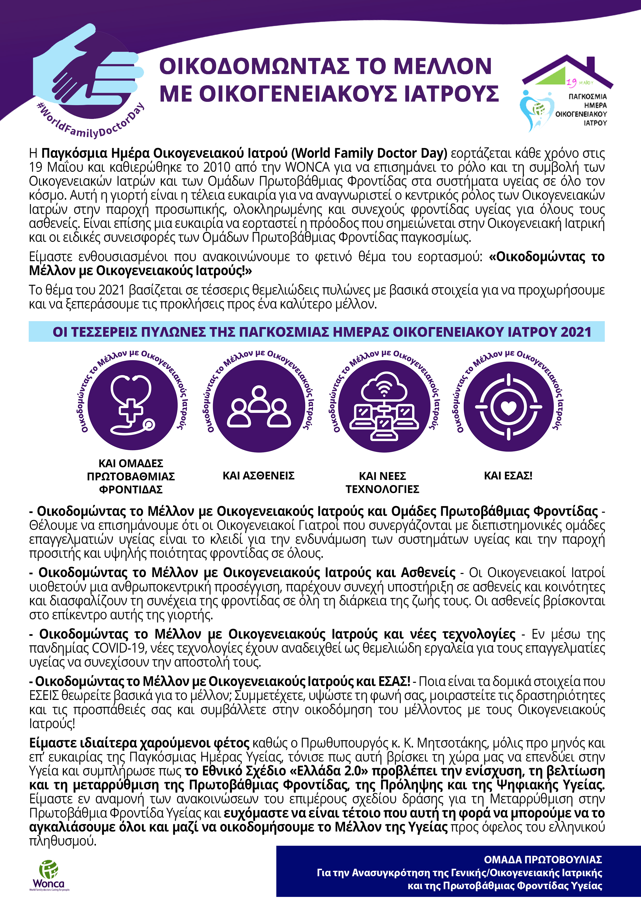 Οικοδομώντας το Μέλλον με Οικογενειακούς Ιατρούς και Ομάδες Πρωτοβάθμιας Φροντίδας - Θέλουμε να επισημάνουμε ότι οι Οικογενειακοί Γιατροί που συνεργάζονται με διεπιστημονικές ομάδες επαγγελματιών υγείας είναι το κλειδί για την ενδυνάμωση των συστημάτων υγείας και την παροχή προσιτής και υψηλής ποιότητας φροντίδας σε όλους.