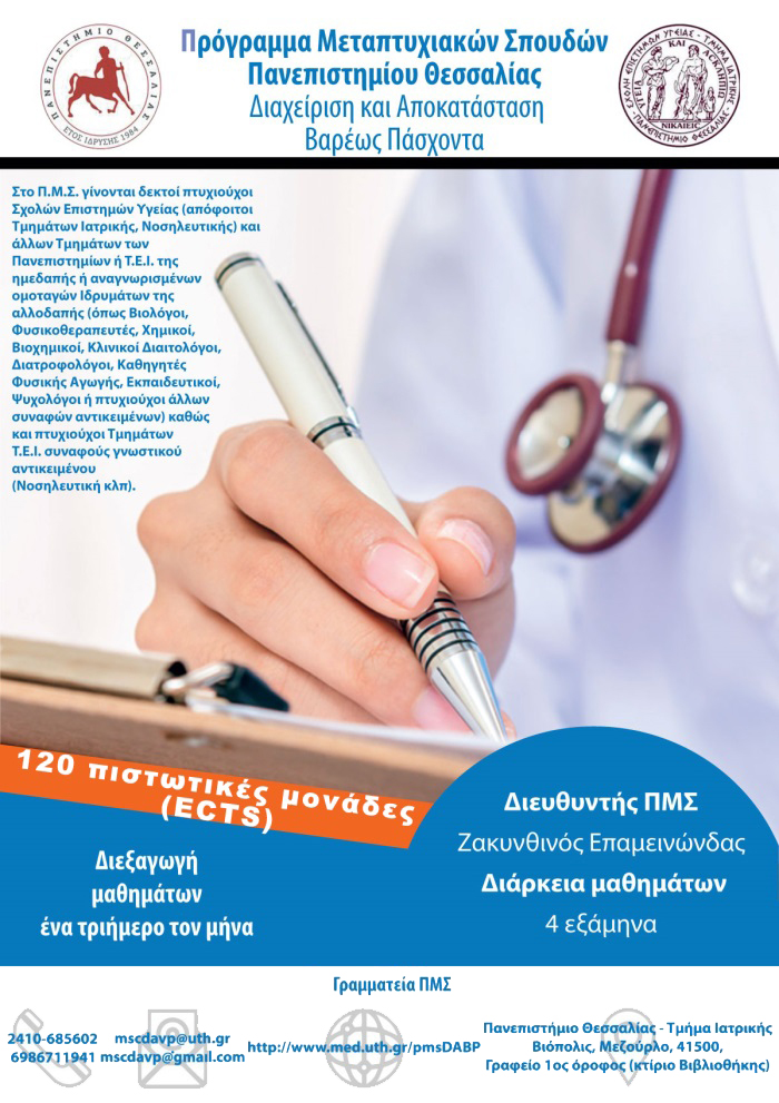 Προκήρυξη ΠΜΣ "Διαχείριση και Αποκατάσταση Βαρέως Πάσχοντα" , Τμήμα Ιατρικής ΠΘ